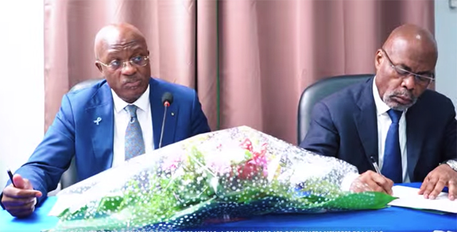 Le ministre de la Communication et des Médias, Paul-Marie Gondjout et le président de la HAC, Germain Ngoyo Moussavou, le 14 novembre 2025. © D.R.