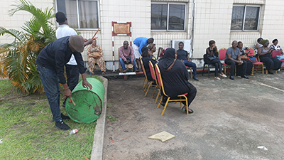 Le décor est planté devant le siège de l’institution : tambours, tonneaux et chaises de fortune. © GabonReview