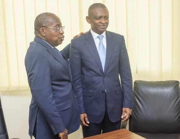Le Secrétaire général de la Chancellerie, Jacques Lebama, installant le nouveau DG, Armand Yébé, dans ses fonctions. © D.R.