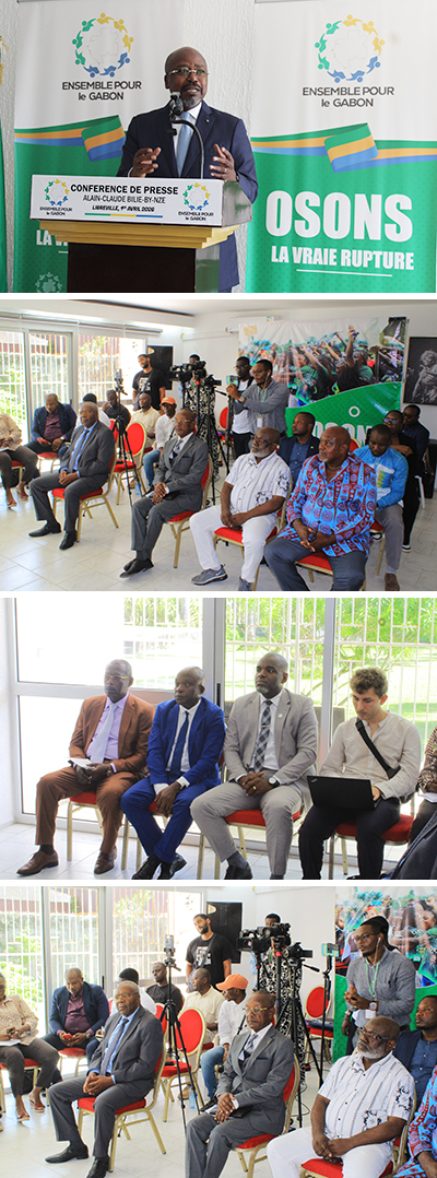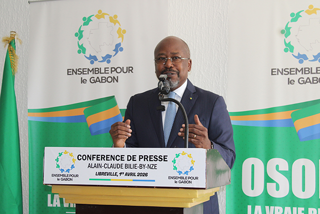 Alain-Claude Bilie-By-Nze, le président d’Ensemble pour le Gabon, lors de sa conférence de presse du 1er avril 2026. © GabonReview