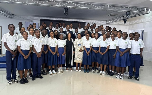 Photo de famille avec les élèves du lycée national Leon Mba, le 26 février 2026 à Libreville. © GabonReview