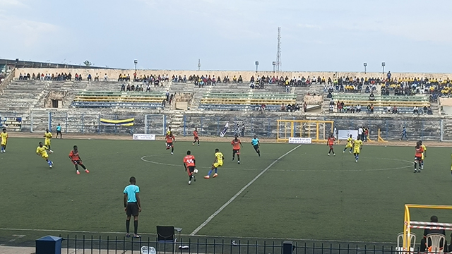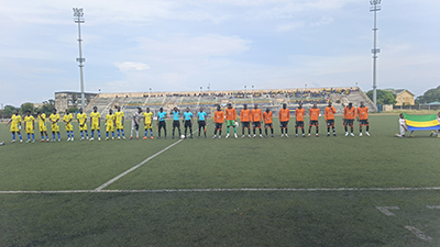 Stade Mandji en jaune et le FC 105 en rouge au début de la rencontre en National Foot 1. © GabonReview