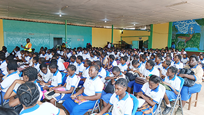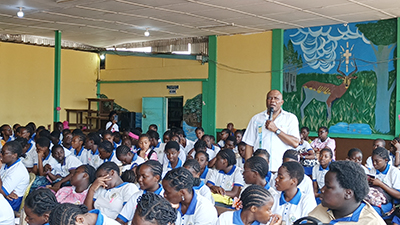 Le Dr. Jonas Mboumba lors de la sensibilisation des filles du Lycée et collège Raponda (LCRW) de Port-Gentil. © GabonReview
