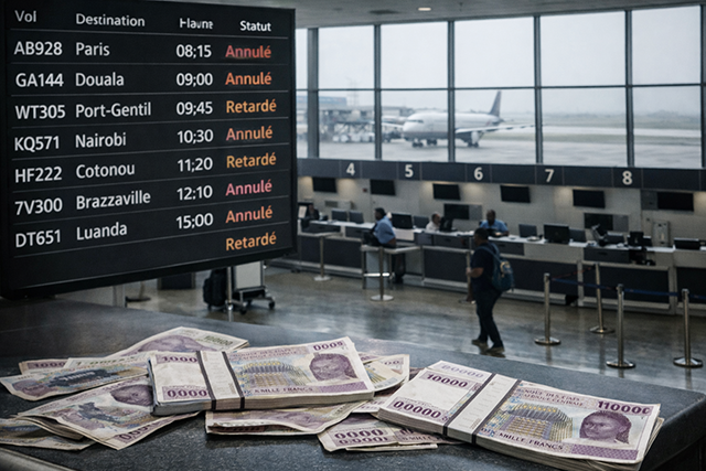 La redevance R4 frappe, les avions se vident, l’IATA craint un effondrement du trafic aérien et du tourisme au Gabon. © GabonReview / Dall-E (Intelligence artificielle)