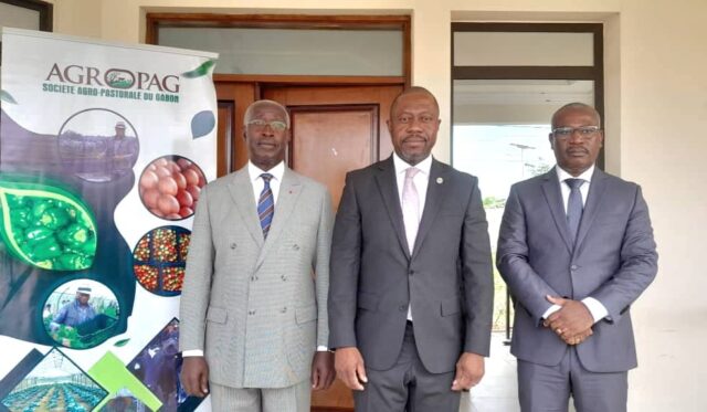 (en partant de la droite) Le DG d’Agropag, le ministre de l’Agriculture et le PCA de la société, lors de leur installation, en mars 2026. © Gabonactu.com