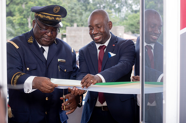 Le gouverneur de la Ngounié et le directeur général de SUNU Assurances Vie Gabon procédant à la coupure symbolique du ruban, le 4 mars 2026 à Mouila. © D.R.