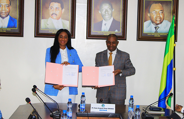 Le Pr Jean-Jacques Tony Ekomié et Scyrielle P. Sende Etali lors de la signature de la convention, le 21 novembre, à Libreville. © GabonReview